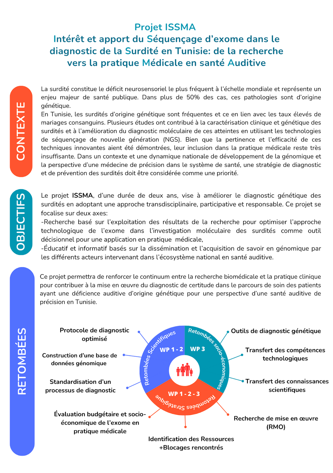 Le projet ISSMA, coordonné par Dr Cherine Charfeddine, chercheur-Associé à l’Institut Pasteur de Tunis et enseignante à l’Institut Supérieur de Biotechnologie de Sidi-Thabet, vise à améliorer le diagnostic génétique des surdités héréditaires en Tunisie en ciblant aussi bien la recherche que l'éducation. Ce projet a bénéficié du soutien de la Fondation Abdelwaheb Ben Ayed, « Dotation FABA », qui œuvre à encourager la recherche fondamentale, appliquée et clinique, dans le domaine de la santé humaine.