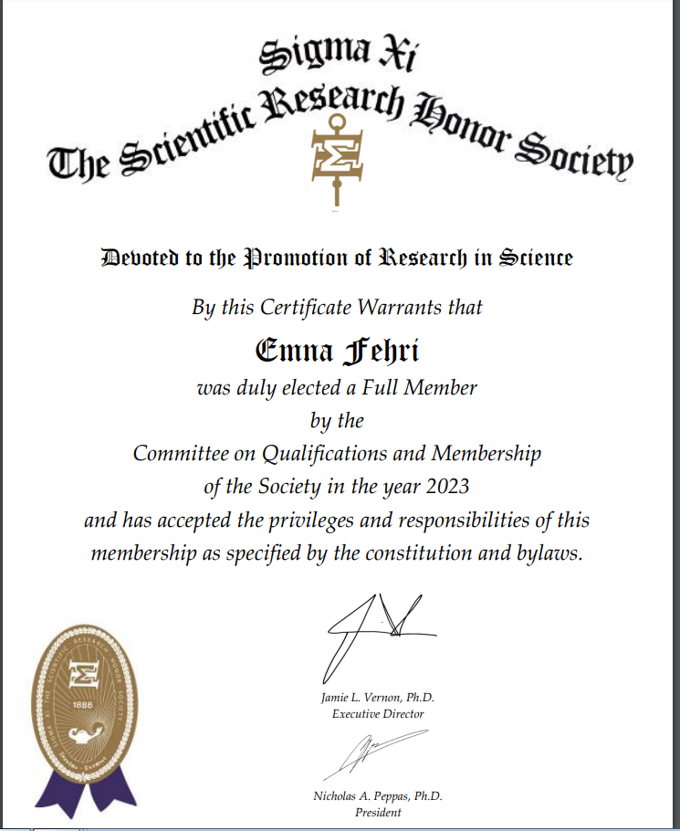 Dr. Emna FEHRI, chercheuse post-doctorale au laboratoire d'épidémiologie moléculaire et de pathologie expérimentale, ainsi qu'au laboratoire d'anatomie pathologique humaine et expérimentale, a été officiellement nommée membre de la prestigieuse société américaine « SIGMA Xi ».