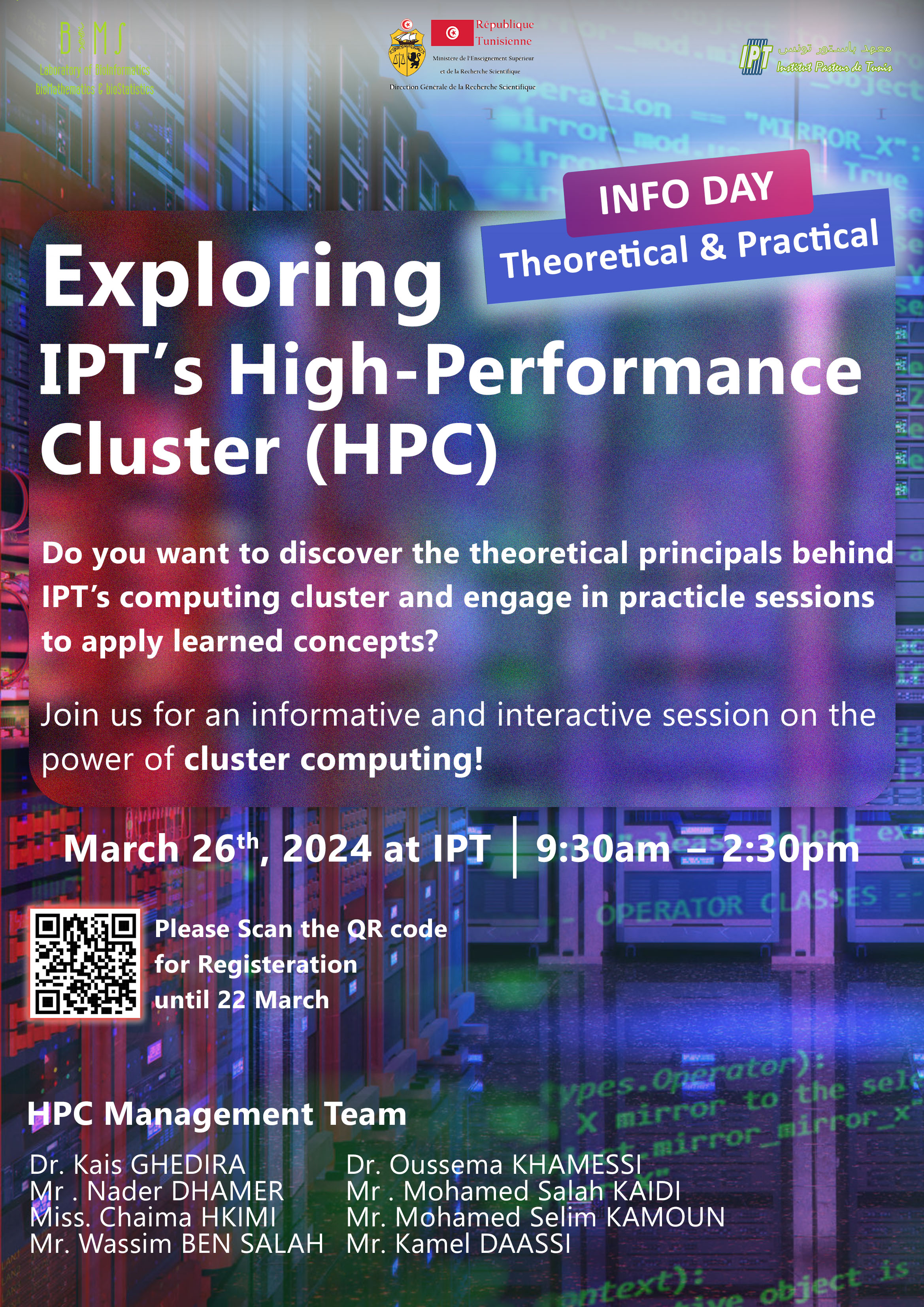 L’équipe responsable de la gestion du cluster de calcul à haute performance (HPC) de l’Institut Pasteur de Tunis, organise une demi journéealtd’information (mini workshop) autour du cluster de calcul institutionnel mis en place dans le cadre du projet PHINDaccess et financé par le ministère de l’enseignement supérieur et la recherche scientifique (MESRS).