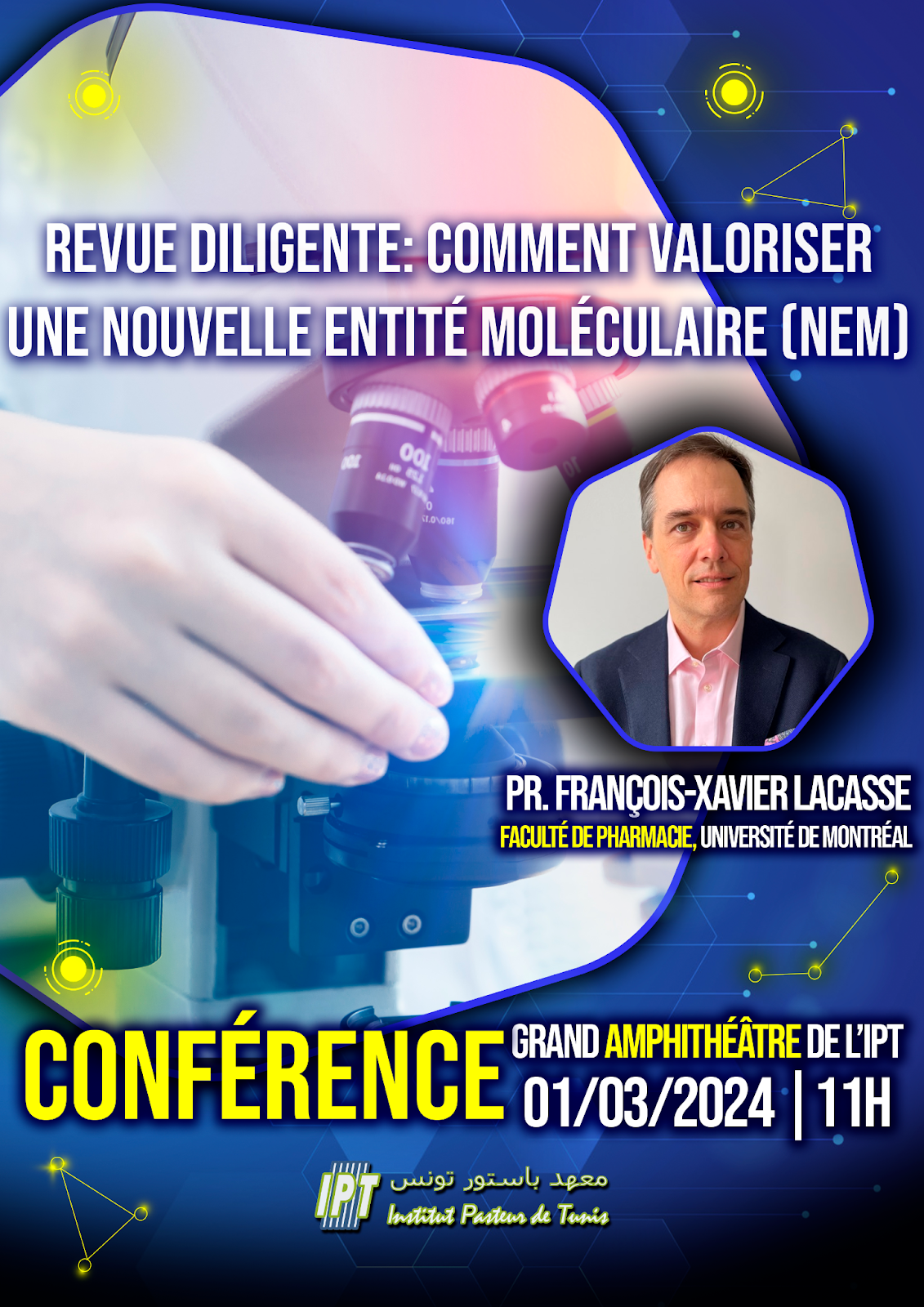 Venez assister à une conférence captivante intitulée" Revue diligente: comment valoriser une nouvelle entité moléculaire (NEM)" présentée par le Professeur François-Xavier Lacasse de la Faculté de Pharmacie de l'Université de Montréal.