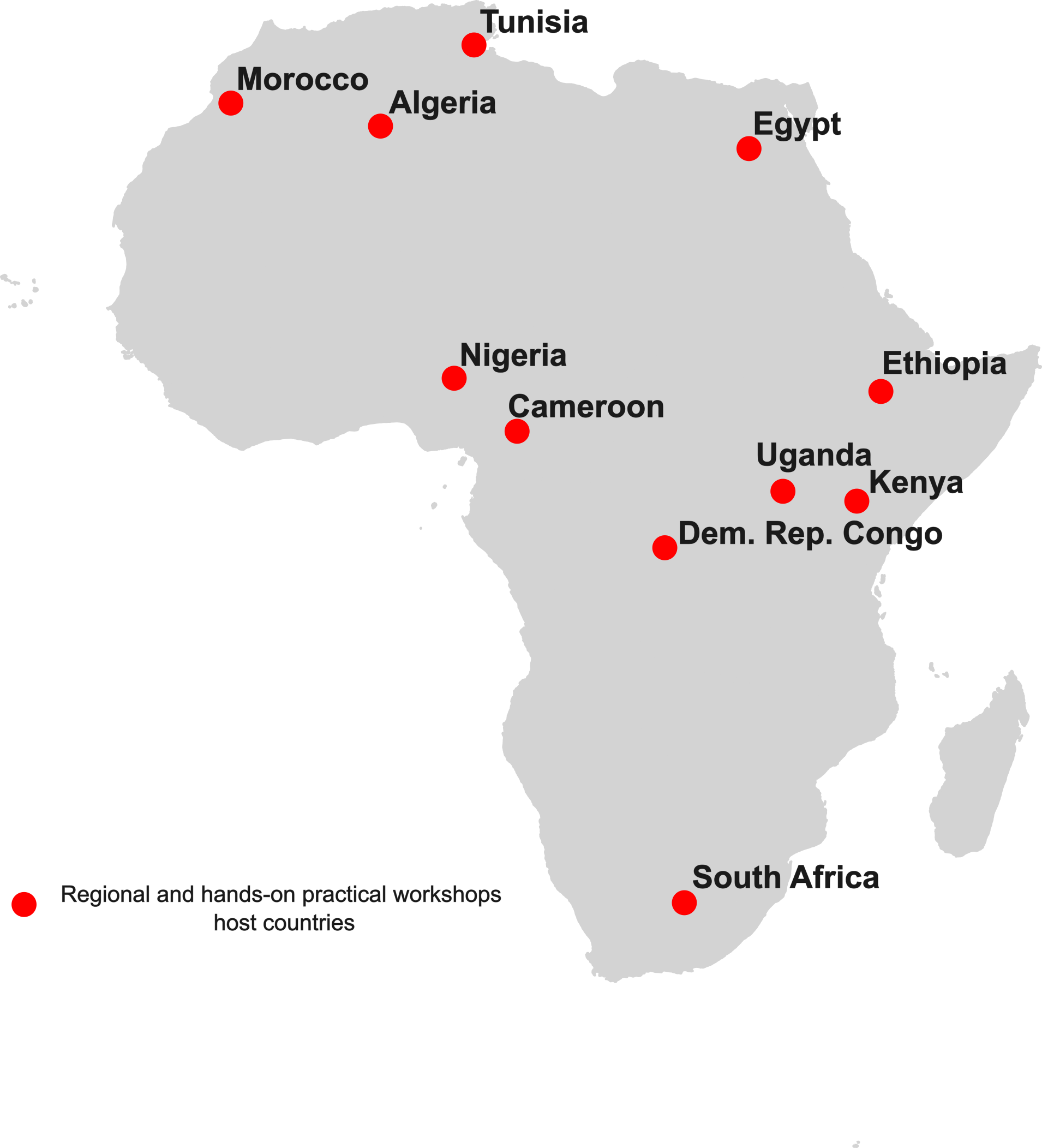 Figure 1: Map showing African countries where 28 AfricaBP Open Institute regional workshops were held in 2023. Host countries are: Nigeria, South Africa, Morocco, Algeria, Egypt, Tunisia, Kenya, Cameroon, DR Congo, Ethiopia, and Uganda