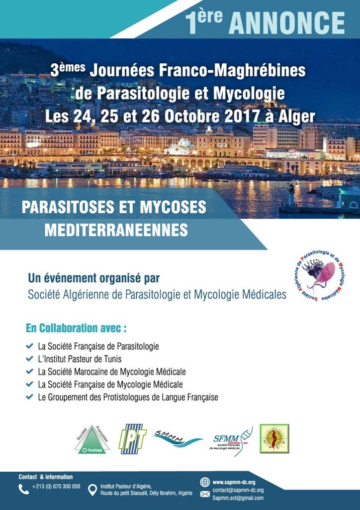 Les 3èmes Journées Franco-Maghrébines de Parasitologie-Mycologie « Parasitoses et Mycoses méditerranéennes auront lieu du 24 au 26 octobre à Alger, Algérie.