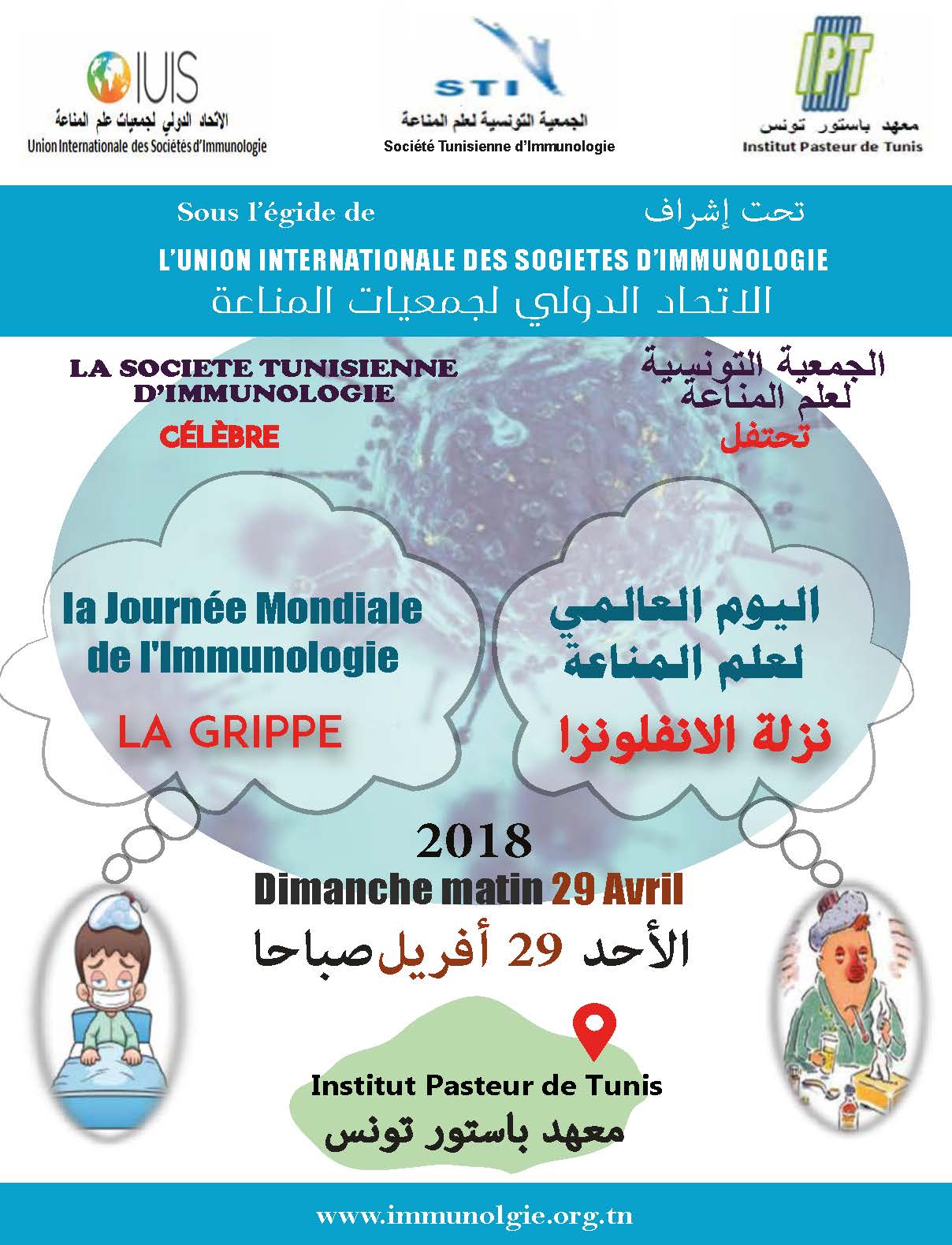 La société tunisienne d'immunologie organise la Journée Mondiale de l'immunologie le 29 avril 2019 à l'Institut Pasteur de Tunis.