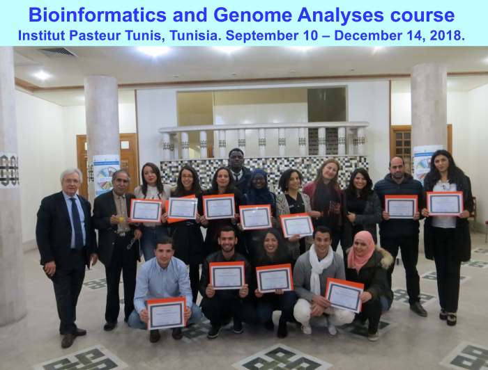 Un cours de haut niveau scientifique de « Bioinformatique et d'Analyse des Génomes » a été organisé à l'Institut Pasteur de Tunis du 10 Septembre aux 14 Décembre 2018 (https://webext.pasteur.fr/tekaia/BCGAIPT2018.html).