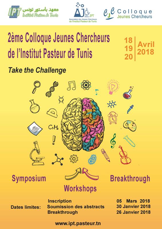 Après la réussite du 1er Colloque Jeunes Chercheurs de l'Institut Pasteur de Tunis 2016, l'association des Jeunes Chercheurs de l'IPT organise le 2ème Colloque Jeunes Chercheurs de l'Institut Pasteur de Tunis, les 18,19 et 20 Avril 2018 à l'IPT.