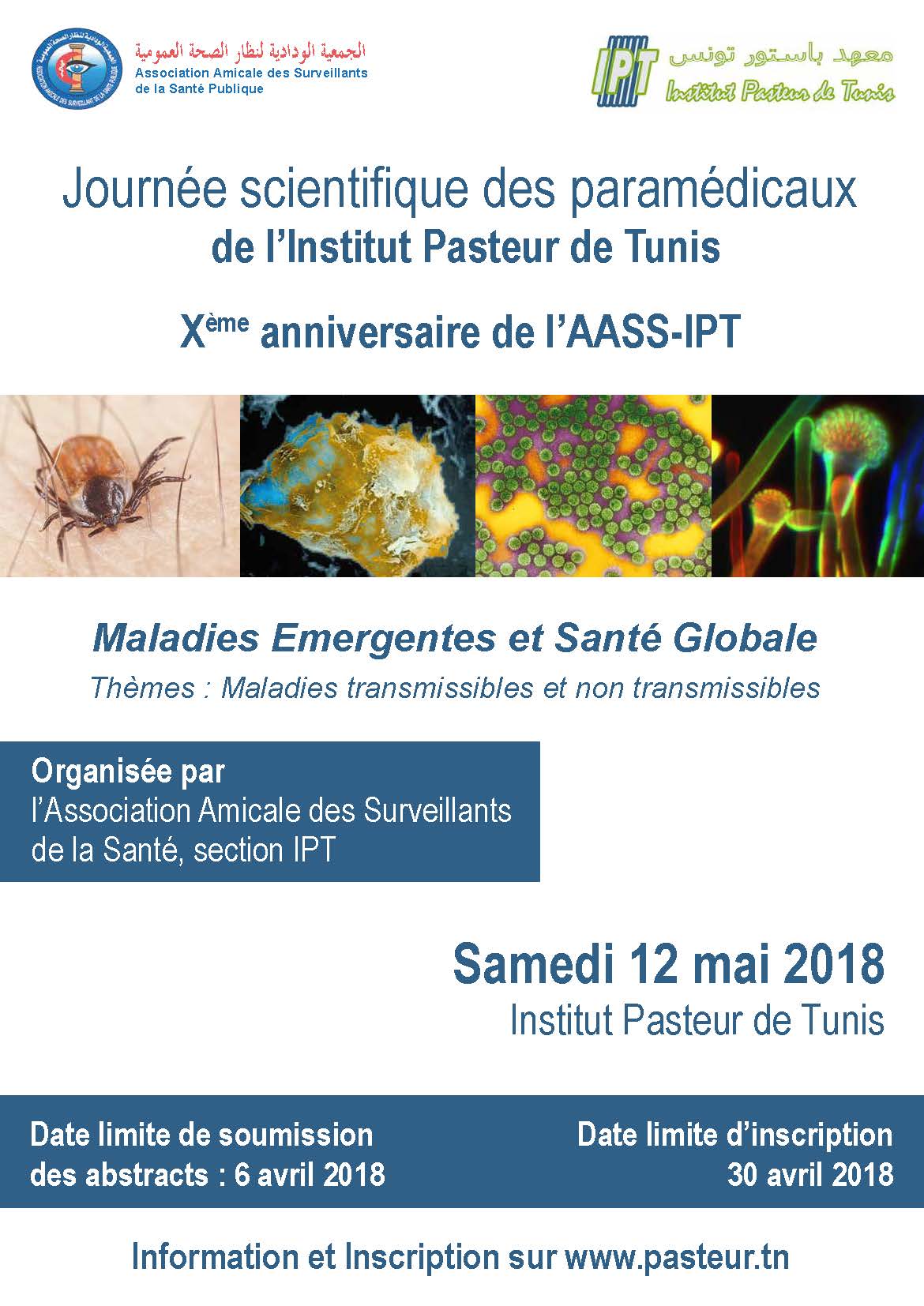 Dans ce cadre, l'association organise une journée scientifique sous le thème "Maladies Emergentes et Santé Publique" et ce le Samedi 12 Mai 2018 à l'Institut Pasteur de Tunis.