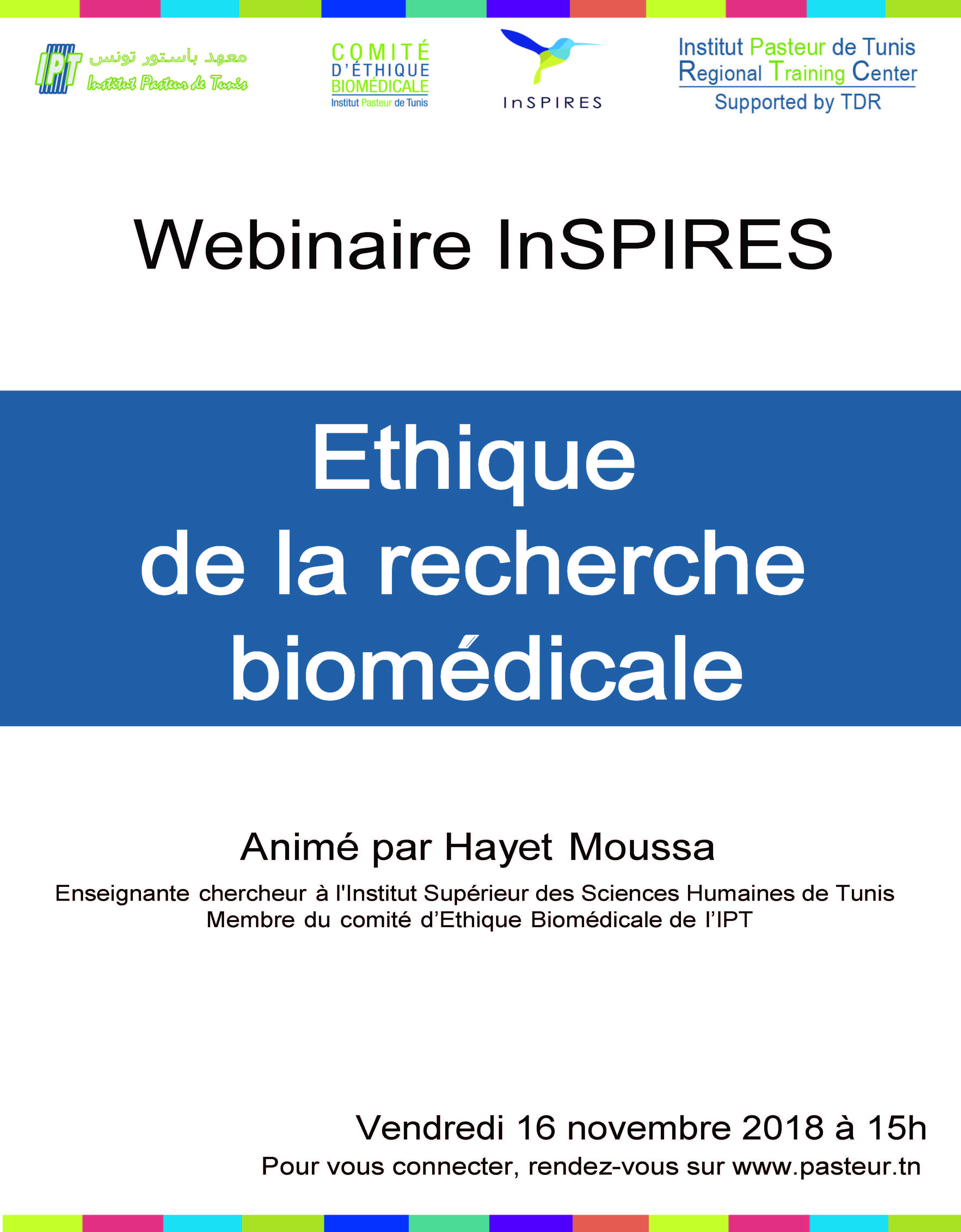 Le projet InSPIRES, le comité d'éthique de l'Institut Pasteur de Tunis (IPT) et le Regional Training Center (RTC), organisent un webinar le vendredi 16 Novembre, à 15 heures d'une durée de 1h00 autour de « l'éthique de la recherche biomédicale».