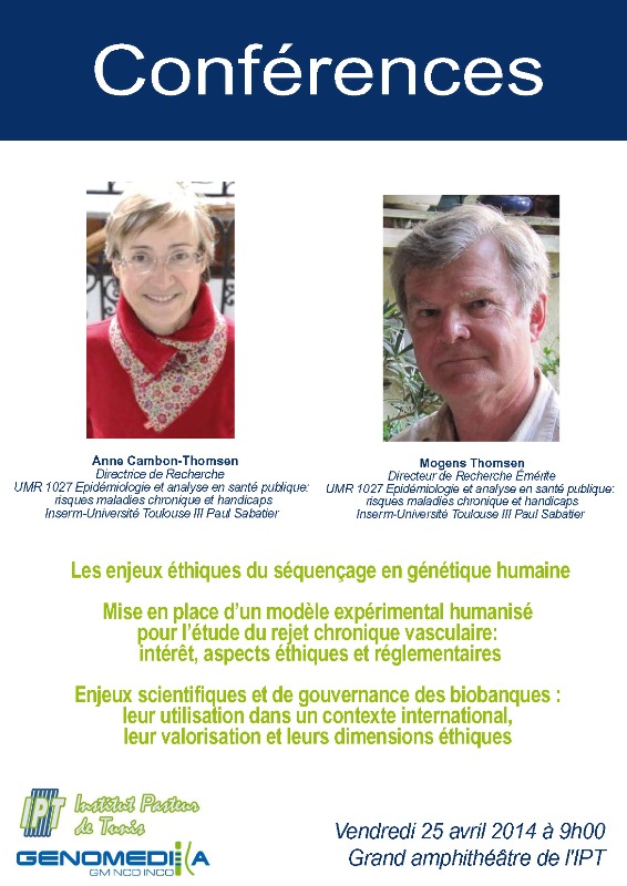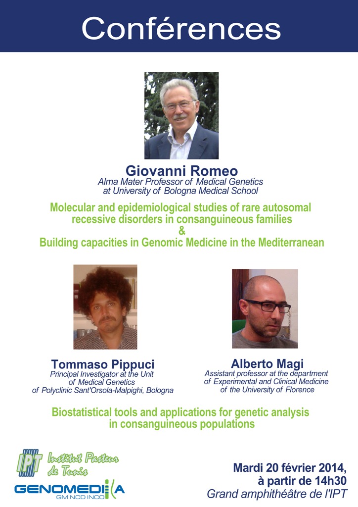 Le jeudi 20 février, à partir de 14h30, dans le grand amphithéâtre, l'IPT et le projet européen Genomedika organisent trois conférences sur le thème de l'investigation génétique des maladies en population consanguine.