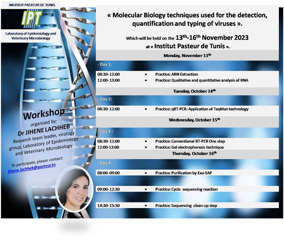 Dans le cadre des activité du laboratoire d'Epidémiologie et de microbiologie vétérinaire, un atelier intitulé "Molecular Biology techniques used for the detection, quantification and typing of viruses " est organisé du 13 au 16 novembre 2023 à l'Institut Pasteur de Tunis.