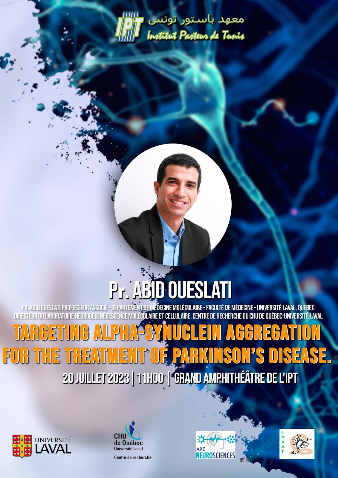 L'Institut Pasteur de Tunis est heureux d'annoncer la tenue d'une conférence en accès libre intitulée "Targeting alpha-synuclein aggregation for the treatment of Parkinson's disease"