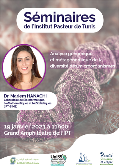 Le treizième séminaire de l'IPT intitulé : Analyse génomique et métagénomique de la diversité des microorganismes sera assuré par Dr. Mariem HANACHI,