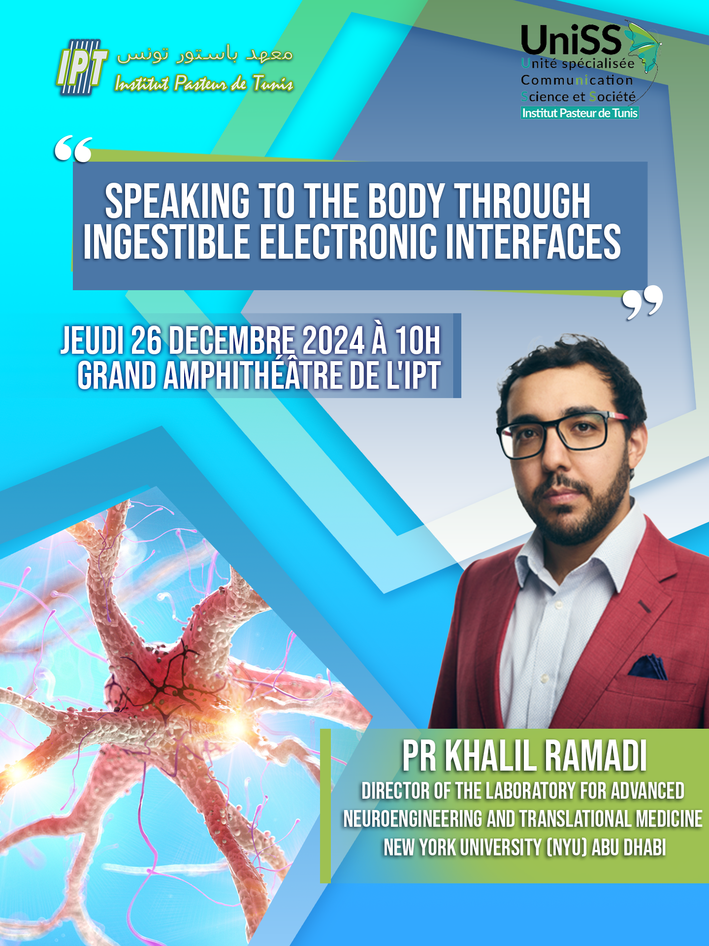 Nous avons le plaisir de vous inviter à une conférence exceptionnelle intitulée "Speaking to the body through ingestible electronic interfaces" présentée par le Professeur Khalil Ramadi, Assistant Professor of Bioengineering and Director of the Laboratory for Advanced Neuroengineering and Translational Medicine à New York University Abu Dhabi.