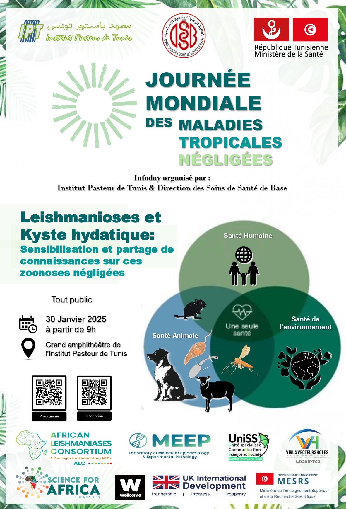 À l’occasion de la Journée Mondiale des Maladies Tropicales Négligées, le projet African Leishmaniases Consortium (ALC) a le plaisir de vous inviter à un Infoday organisé par l'Institut Pasteur de Tunis, en collaboration avec la Direction des Soins de Santé de Base (DSSB).