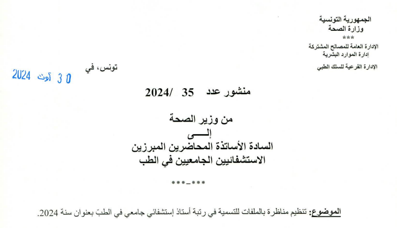 Le Ministère de la Santé organise un concours sur dossiers pour la nomination au grade de professeur hospitalo-universitaire en médecine le 31 octobre 2024, ainsi que les jours suivants, à la Faculté de Médecine de Tunis.