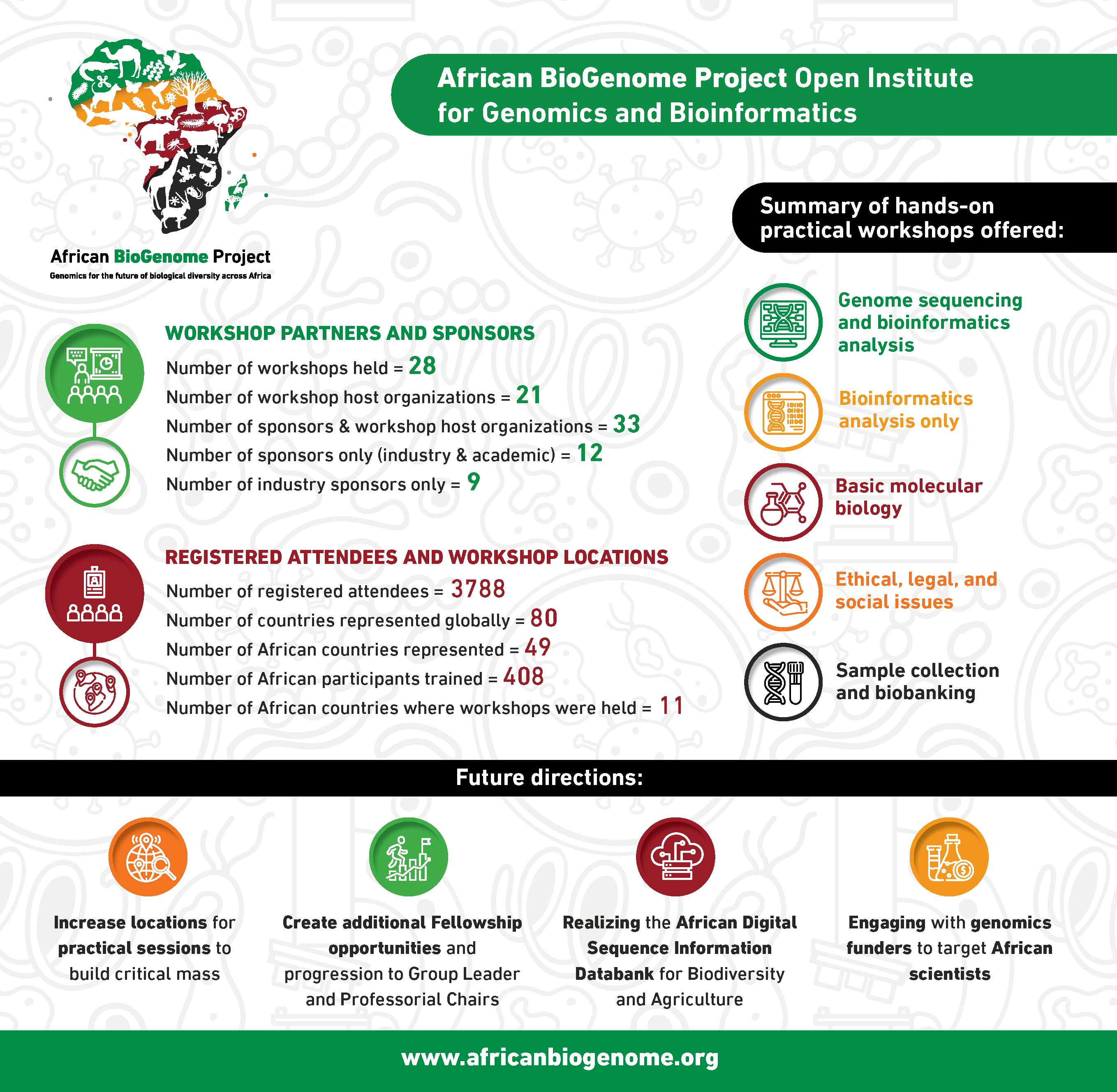 The African BioGenome Project (AfricaBP) implemented a successful series of workshops in 2023 referred to as the Open Institute for Genomics and Bioinformatics Regional Workshops (Open Institute), as reported in Nature Genetics.
