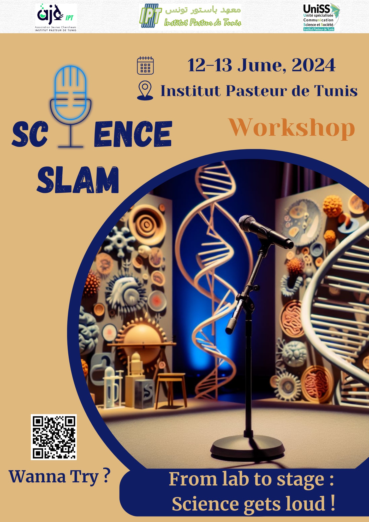 L’Association des Jeunes Chercheurs de l’Institut Pasteur (AJC-IPT) et Unité Spécialisée Communication Science et Société (UniSS) ont le plaisir de vous annoncer la tenue du troisième Workshop SCIENCE SLAM, qui se tiendra le 12 et 13 juin 2024 à l’Institut Pasteur de Tunis.