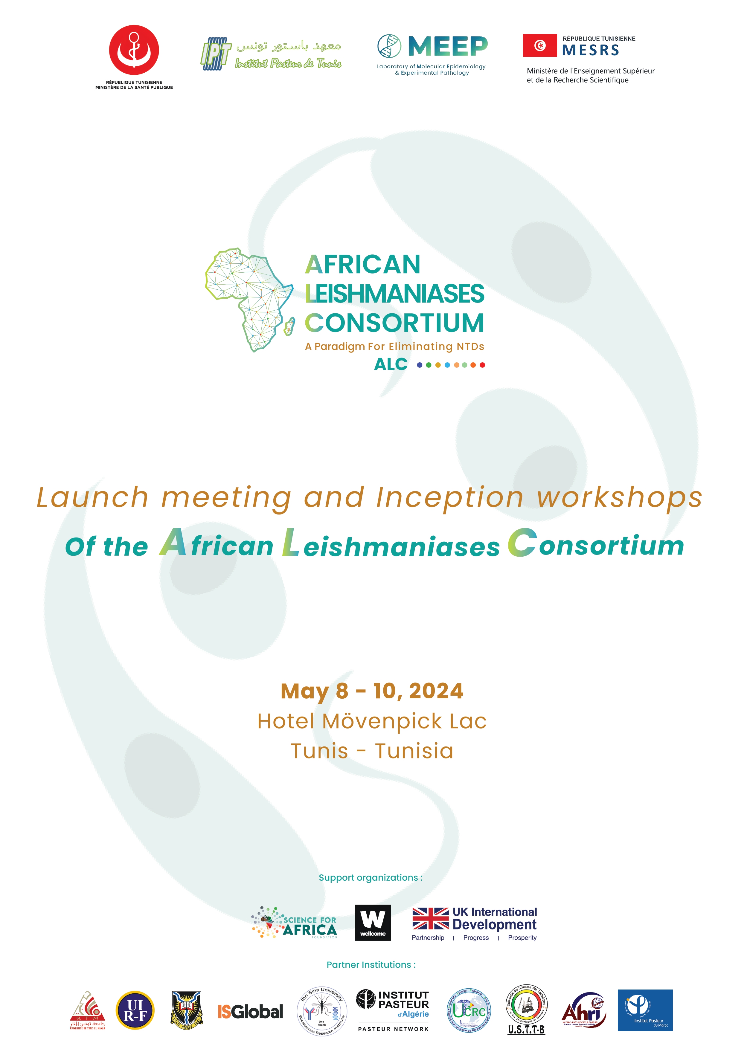 L'Institut Pasteur de Tunis organise du 8 au 10 mai 2024, le Kick-off meeting du « Consortium Africain sur les Leishmanioses » à l'Hôtel Mövenpick Hotel du Lac Tunis.